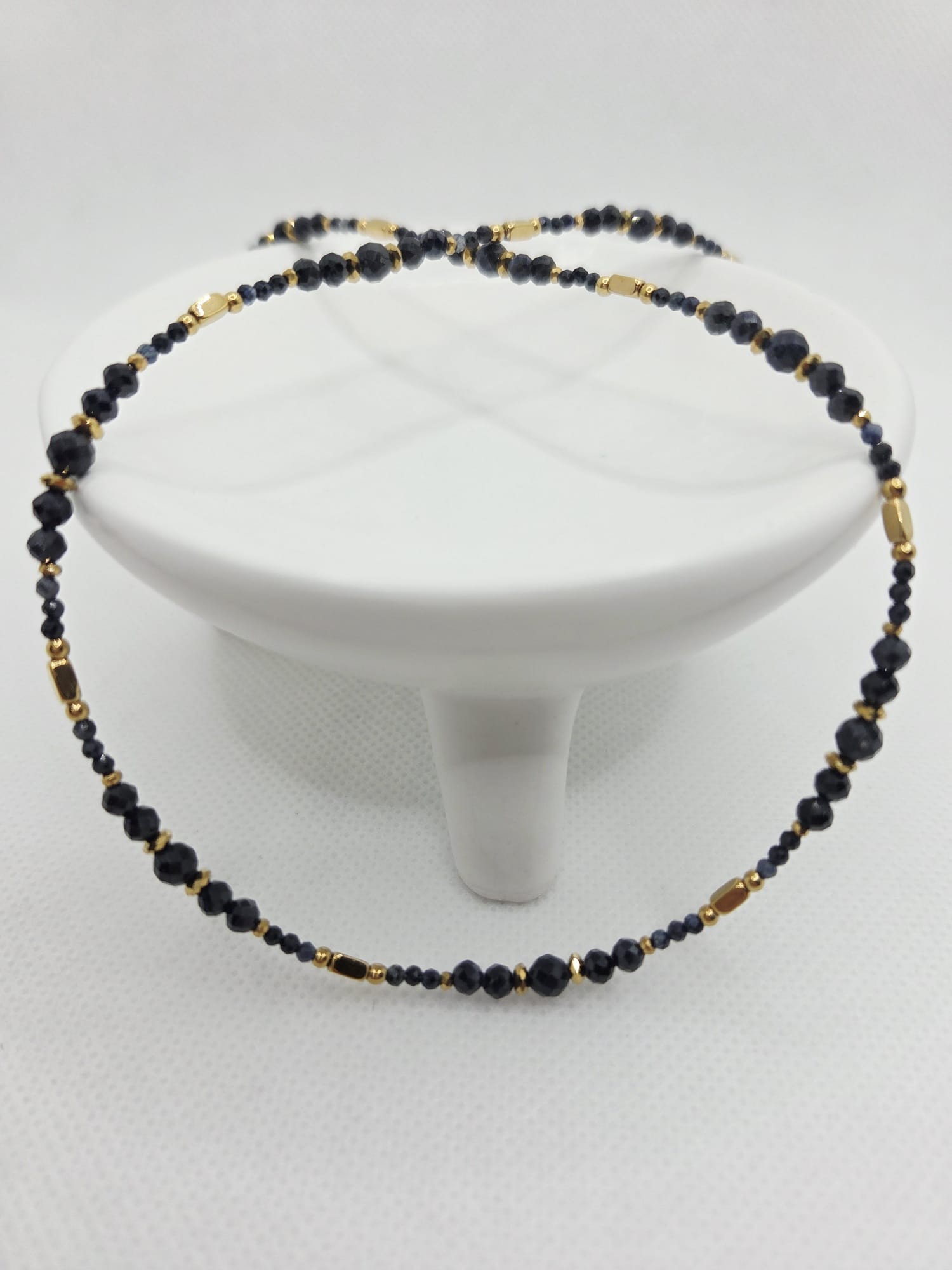 Wykonany został z hematytu oraz Szafiru o wielkości 2-3-4 mm oraz wykończony stalą chirurgiczną. Długość naszyjnika 44 cm + 5 cm przedłużka.